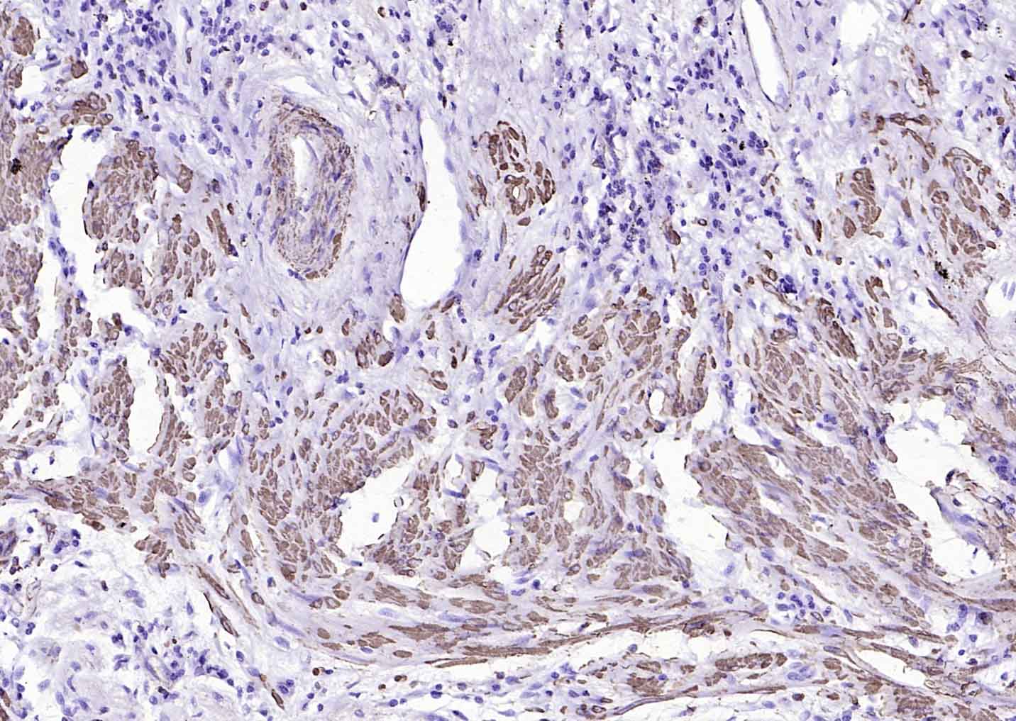 Paraformaldehyde-fixed, paraffin embedded (human uterus); Antigen retrieval by boiling in sodium citrate buffer (pH6.0) for 15min; Block endogenous peroxidase by 3% hydrogen peroxide for 20 minutes; Blocking buffer (normal goat serum) at 37°C for 30min; Antibody incubation with (alpha smooth muscle Actin) Monoclonal Antibody, Unconjugated (bsm-33187M) at 1:200 overnight at 4°C, followed by operating according to SP Kit(Mouse)(sp-0024 bs-0296G-HRP 1:200) instructionsand DAB staining.