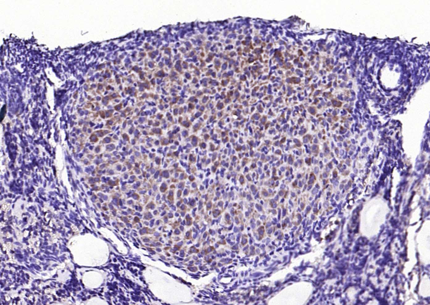 Paraformaldehyde-fixed, paraffin embedded (mouse ovary); Antigen retrieval by boiling in sodium citrate buffer (pH6.0) for 15min; Block endogenous peroxidase by 3% hydrogen peroxide for 20 minutes; Blocking buffer (normal goat serum) at 37°C for 30min; Antibody incubation with (phospho-STMN1 (Ser63)) Polyclonal Antibody, Unconjugated (bs-9764R) at 1:200 overnight at 4°C, followed by operating according to SP Kit(Rabbit) (sp-0023) instructionsand DAB staining.