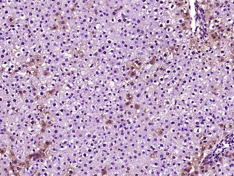 Paraformaldehyde-fixed, paraffin embedded (Rat liver); Antigen retrieval by boiling in sodium citrate buffer (pH6.0) for 15min; Block endogenous peroxidase by 3% hydrogen peroxide for 20 minutes; Blocking buffer (normal goat serum) at 37°C for 30min; Antibody incubation with (Apolipoprotein E) Polyclonal Antibody, Unconjugated (bs-4892R) at 1:400 overnight at 4°C, followed by operating according to SP Kit(Rabbit) (sp-0023) instructionsand DAB staining.