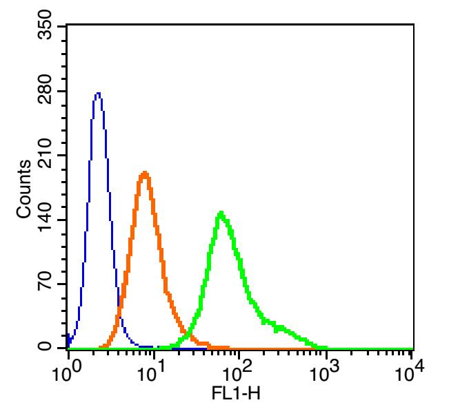 Blank control(blue): Hela(fixed with 2% paraformaldehyde (10 min) and then permeabilized with ice-cold 90% methanol for 30 min on ice). Primary Antibody: Rabbit Anti- phospho-SNAIL + SLUG (Ser246)/AF488 antibody(bs-11962R-AF488), Dilution: 1μg in 100 μL 1X PBS containing 0.5% BSA; Isotype Control Antibody: Rabbit IgG/FITC(orange) ,used under the same conditions.