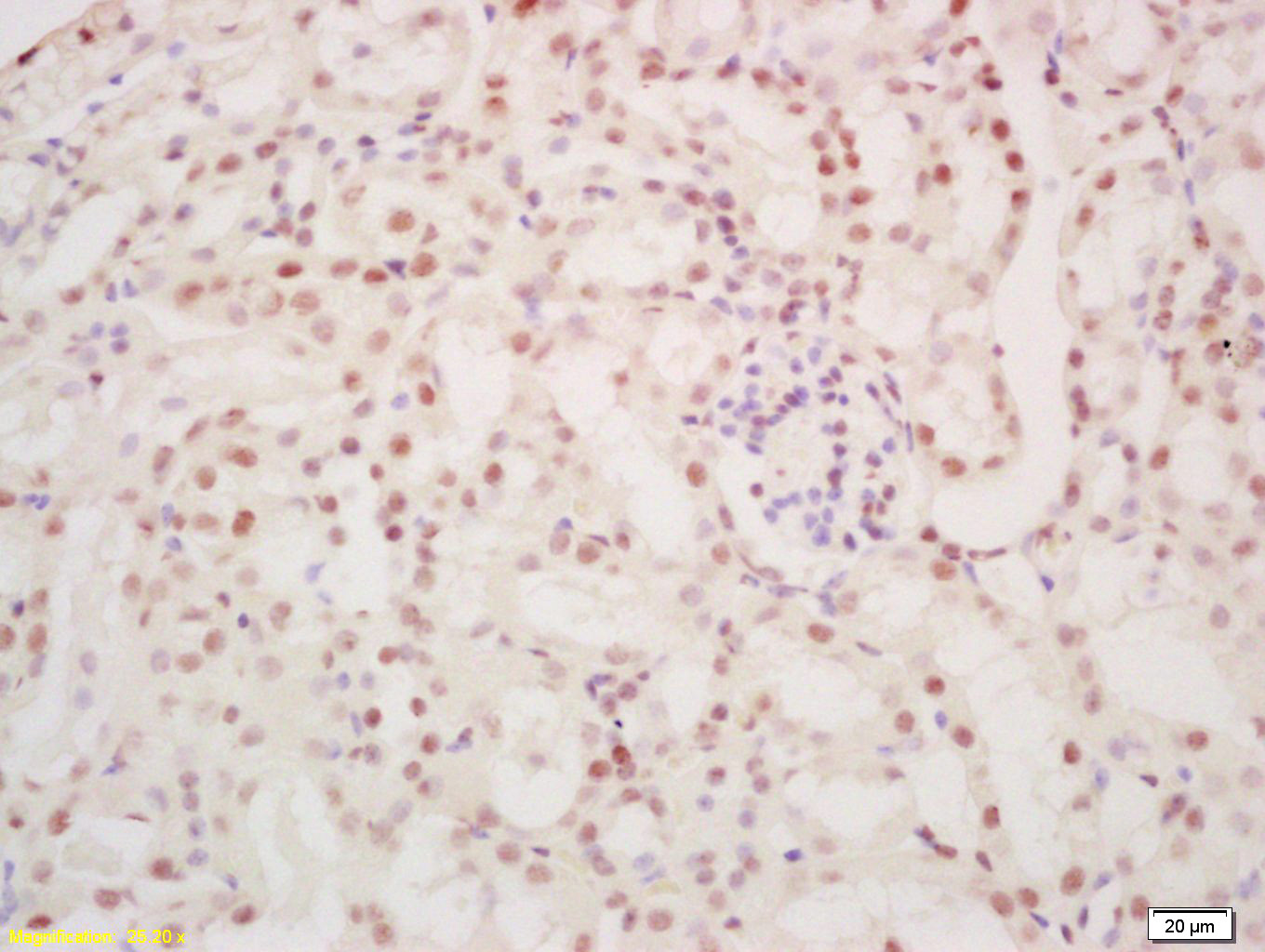 Paraformaldehyde-fixed, paraffin embedded (Rat kidney); Antigen retrieval by boiling in sodium citrate buffer (pH6.0) for 15min; Block endogenous peroxidase by 3% hydrogen peroxide for 20 minutes; Blocking buffer (normal goat serum) at 37°C for 30min; Antibody incubation with (SALL1) Polyclonal Antibody, Unconjugated (bs-12203R) at 1:400 overnight at 4°C, followed by operating according to SP Kit(Rabbit) (sp-0023) instructionsand DAB staining.