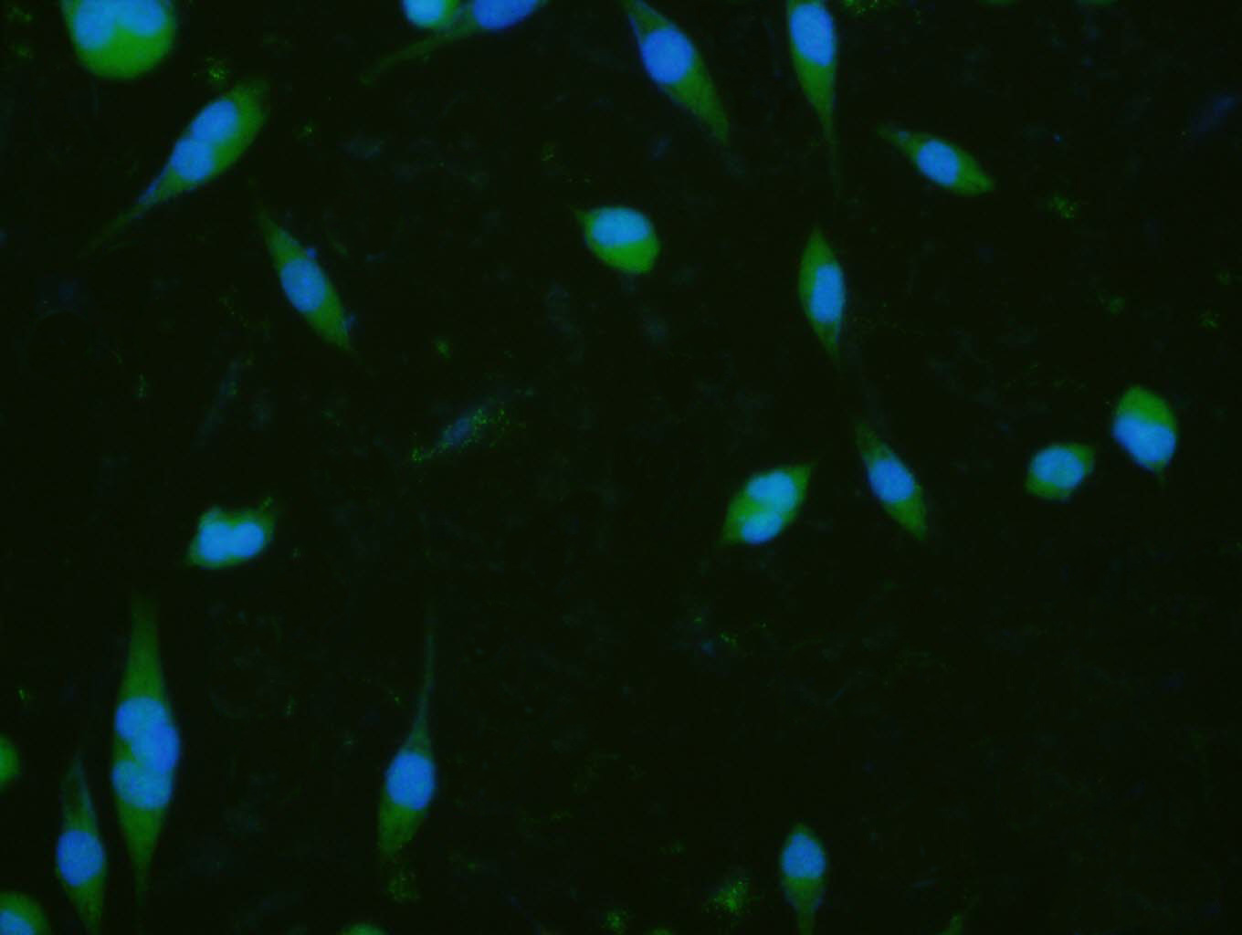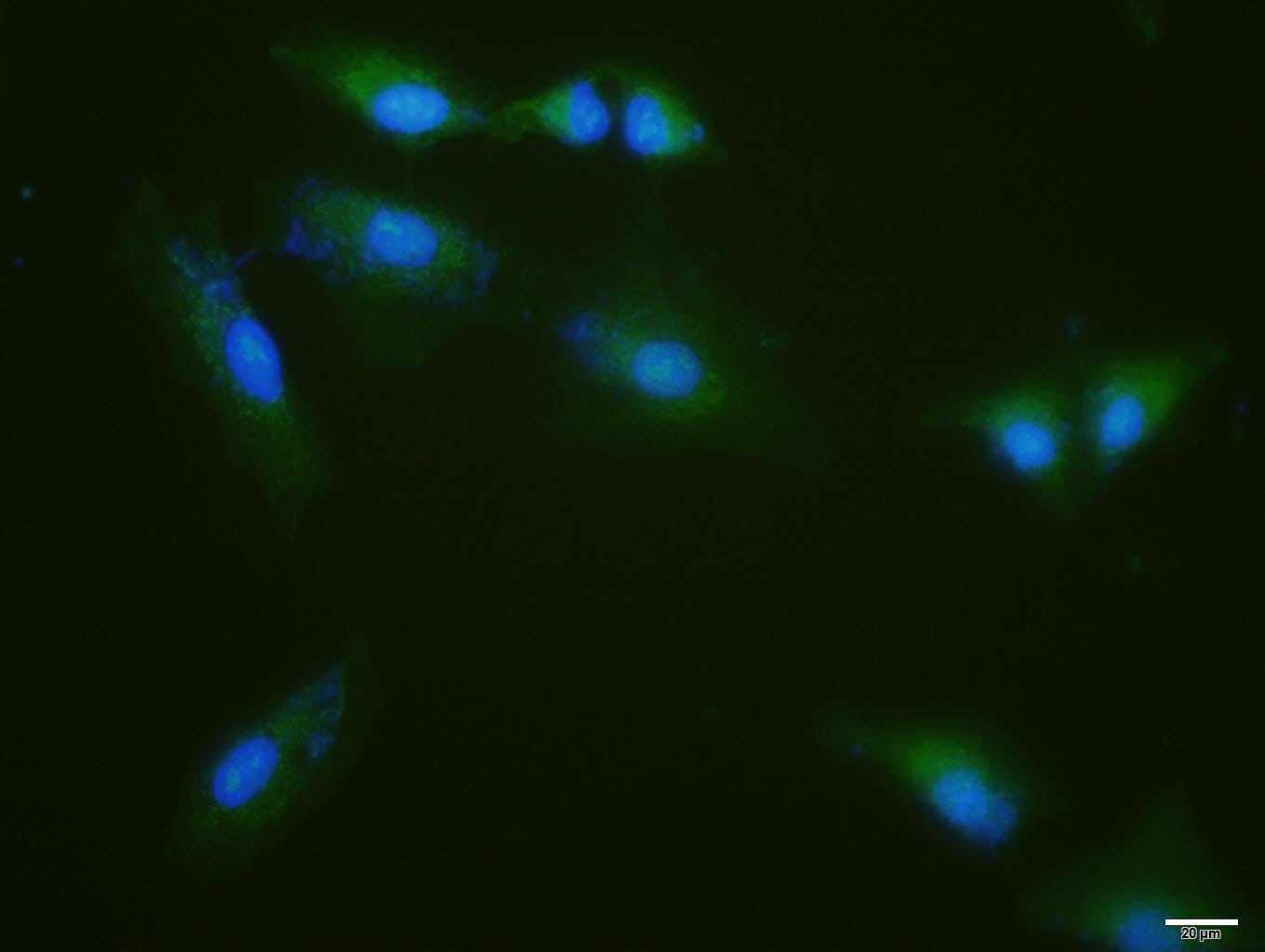 A-431 cell; 4% Paraformaldehyde-fixed; Triton X-100 at room temperature for 20 min; Blocking buffer (normal goat serum, C-0005) at 37°C for 20 min; Antibody incubation with (KEAP1) polyclonal Antibody, Unconjugated (bs-4900R) 1:100, 90 minutes at 37°C; followed by a conjugated Goat Anti-Rabbit IgG antibody at 37°C for 90 minutes, DAPI (blue, C02-04002) was used to stain the cell nuclei.