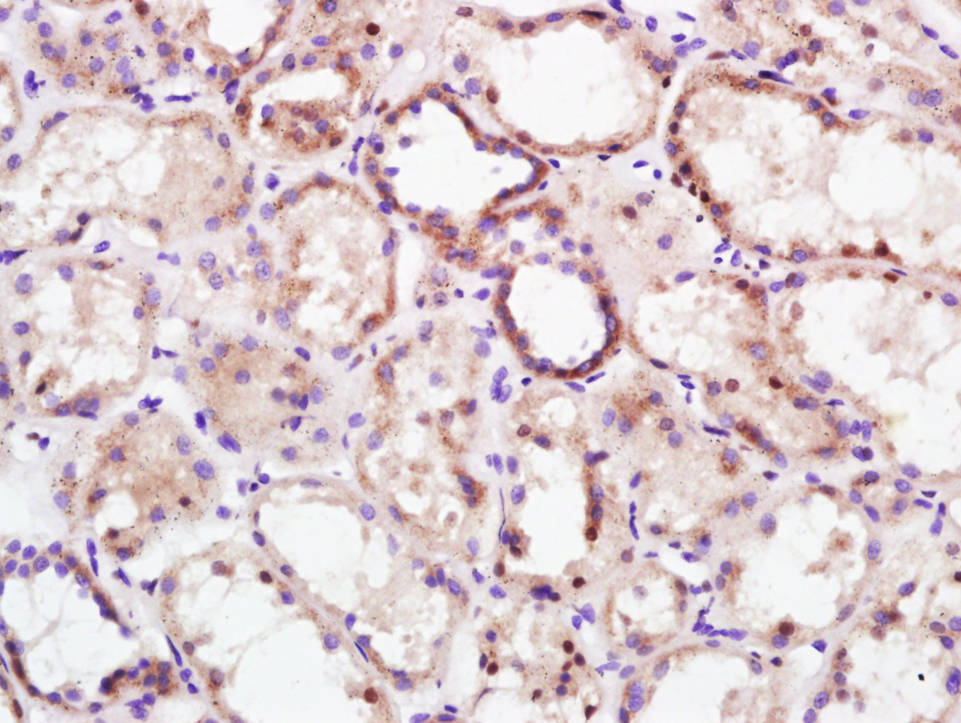 Paraformaldehyde-fixed, paraffin embedded (Human kidney); Antigen retrieval by boiling in sodium citrate buffer (pH6.0) for 15min; Block endogenous peroxidase by 3% hydrogen peroxide for 20 minutes; Blocking buffer (normal goat serum) at 37°C for 30min; Antibody incubation with (KEAP1) Polyclonal Antibody, Unconjugated (bs-4900R) at 1:400 overnight at 4°C, followed by a conjugated secondary antibody (sp-0023) for 20 minutes and DAB staining.