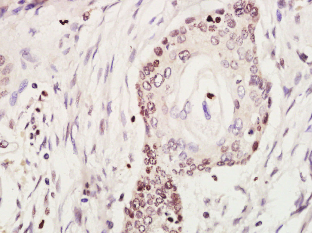Paraformaldehyde-fixed, paraffin embedded (Human cervical carcinoma); Antigen retrieval by boiling in sodium citrate buffer (pH6.0) for 15min; Block endogenous peroxidase by 3% hydrogen peroxide for 20 minutes; Blocking buffer (normal goat serum) at 37°C for 30min; Antibody incubation with (KEAP1) Polyclonal Antibody, Unconjugated (bs-4900R) at 1:500 overnight at 4°C, followed by a conjugated secondary (sp-0023) for 20 minutes and DAB staining.