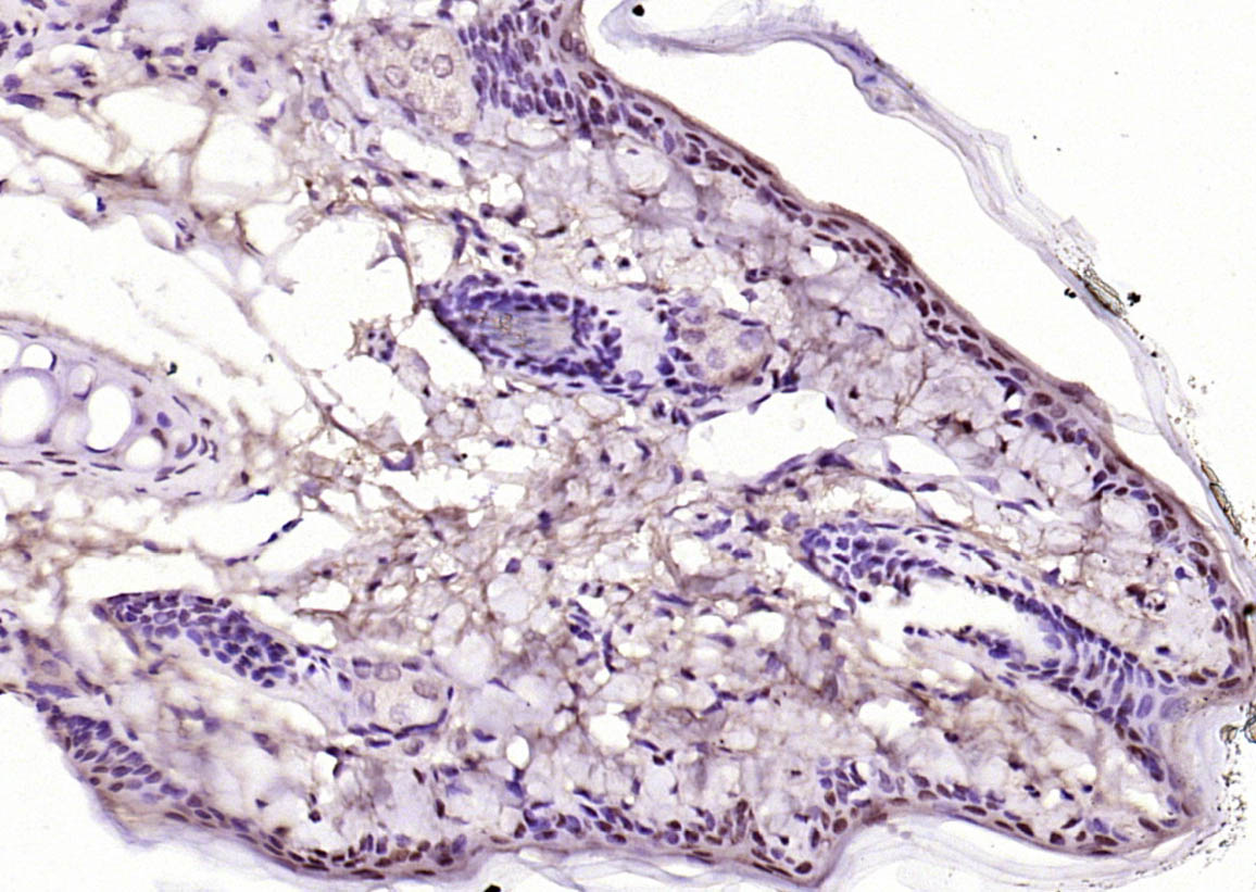 Paraformaldehyde-fixed, paraffin embedded (mouse skin); Antigen retrieval by boiling in sodium citrate buffer (pH6.0) for 15min; Block endogenous peroxidase by 3% hydrogen peroxide for 20 minutes; Blocking buffer (normal goat serum) at 37°C for 30min; Antibody incubation with (KEAP1) Polyclonal Antibody, Unconjugated (bs-4900R) at 1:200 overnight at 4°C, followed by operating according to SP Kit(Rabbit) (sp-0023) instructionsand DAB staining.