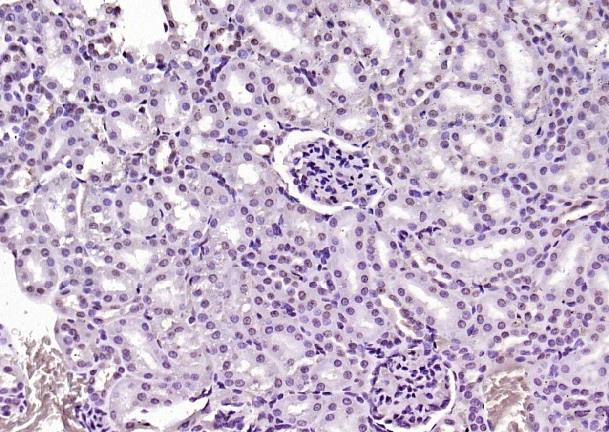 Paraformaldehyde-fixed, paraffin embedded (rat kidney); Antigen retrieval by boiling in sodium citrate buffer (pH6.0) for 15min; Block endogenous peroxidase by 3% hydrogen peroxide for 20 minutes; Blocking buffer (normal goat serum) at 37°C for 30min; Antibody incubation with (KEAP1) Polyclonal Antibody, Unconjugated (bs-4900R) at 1:200 overnight at 4°C, followed by operating according to SP Kit(Rabbit) (sp-0023) instructionsand DAB staining.
