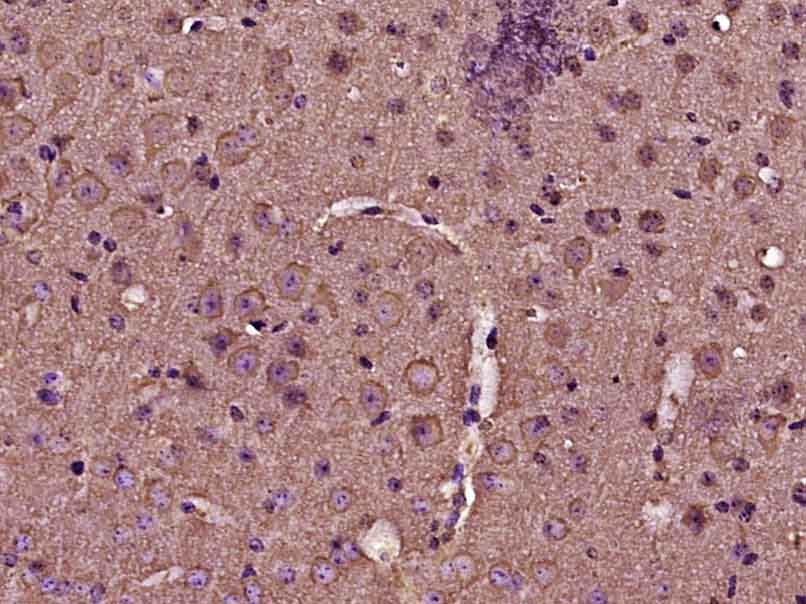 Paraformaldehyde-fixed, paraffin embedded (Mouse brain); Antigen retrieval by boiling in sodium citrate buffer (pH6.0) for 15min; Block endogenous peroxidase by 3% hydrogen peroxide for 20 minutes; Blocking buffer (normal goat serum) at 37°C for 30min; Antibody incubation with (phospho-IRS1 (Ser616)) Polyclonal Antibody, Unconjugated (bs-12710R) at 1:400 overnight at 4°C, followed by operating according to SP Kit(Rabbit) (sp-0023) instructionsand DAB staining.
