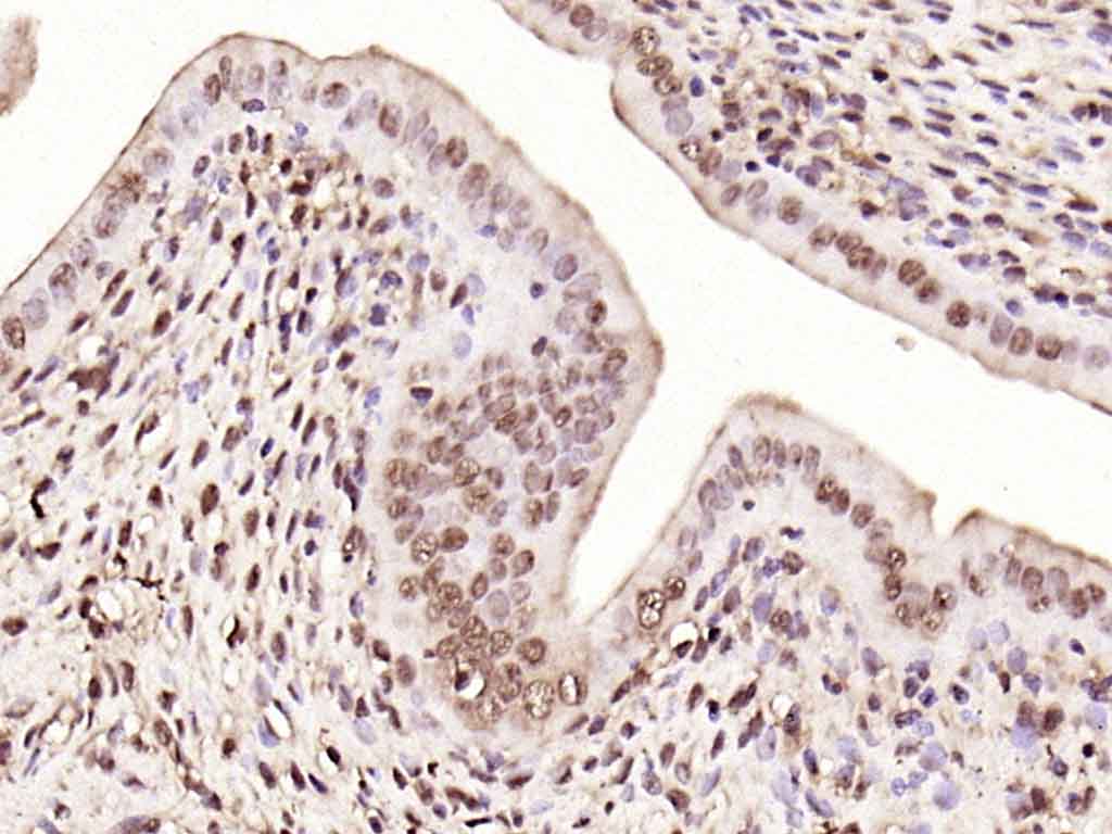 Paraformaldehyde-fixed, paraffin embedded (rat uterus); Antigen retrieval by boiling in sodium citrate buffer (pH6.0) for 15min; Block endogenous peroxidase by 3% hydrogen peroxide for 20 minutes; Blocking buffer (normal goat serum) at 37°C for 30min; Antibody incubation with (phospho-IRS1 (Ser616)) Polyclonal Antibody, Unconjugated (bs-12710R) at 1:200 overnight at 4°C, followed by operating according to SP Kit(Rabbit) (sp-0023) instructionsand DAB staining.