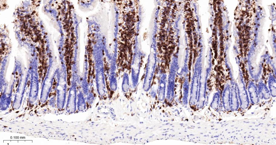 Paraformaldehyde-fixed, paraffin embedded Mouse Small Intestine; Antigen retrieval by boiling in sodium citrate buffer (pH6.0) for 15 min; Antibody incubation with CD45 Polyclonal Antibody, Unconjugated(bs-10602R) at 1:200 overnight at 4°C, followed by conjugation to the bs-0295G-HRP and DAB (C-0010) staining.