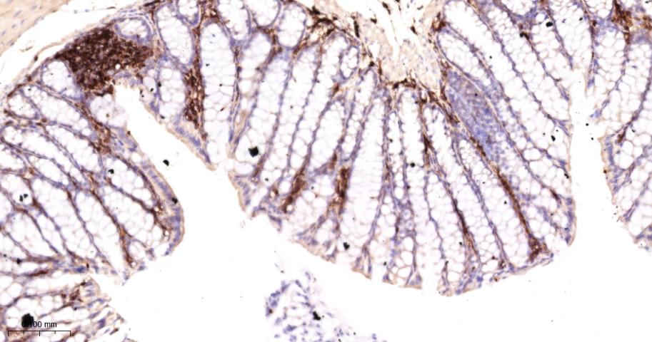 Paraformaldehyde-fixed, paraffin embedded Mouse Colon; Antigen retrieval by boiling in sodium citrate buffer (pH6.0) for 15 min; Antibody incubation with CD45 Polyclonal Antibody, Unconjugated(bs-10602R) at 1:200 overnight at 4°C, followed by conjugation to the bs-0295G-HRP and DAB (C-0010) staining.