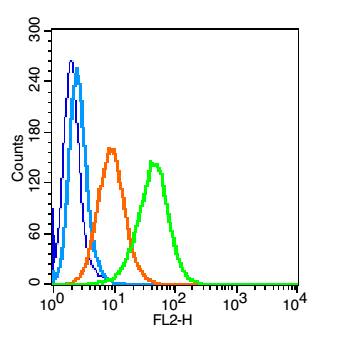 Blank control(blue): U937(fixed with 2% paraformaldehyde (10 min)). Primary Antibody:Rabbit Anti-CD101 antibody(bs-10727R), Dilution: 1μg in 100 μL 1X PBS containing 0.5% BSA; Isotype Control Antibody: Rabbit IgG(orange) ,used under the same conditions ); Secondary Antibody: Goat anti-rabbit IgG-PE(white blue), Dilution: 1:200 in 1 X PBS containing 0.5% BSA.
