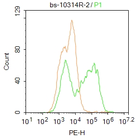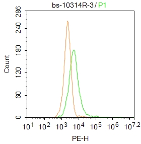 The cells were washed twice with phosphate-buffered saline (PBS).The cells were then incubated in 1 X PBS containing 0.5% BSA + 1 0% goat serum (15 min) to block non-specific protein-protein interactions followed by the antibody (bs-10314R, 5μg /1x10^6 cells) for 30 min on ice. The secondary antibody used was Goat Anti-rabbit IgG/PE antibody at 1/200 dilution for 30 min on ice. Acquisition of 20,000 events was performed.