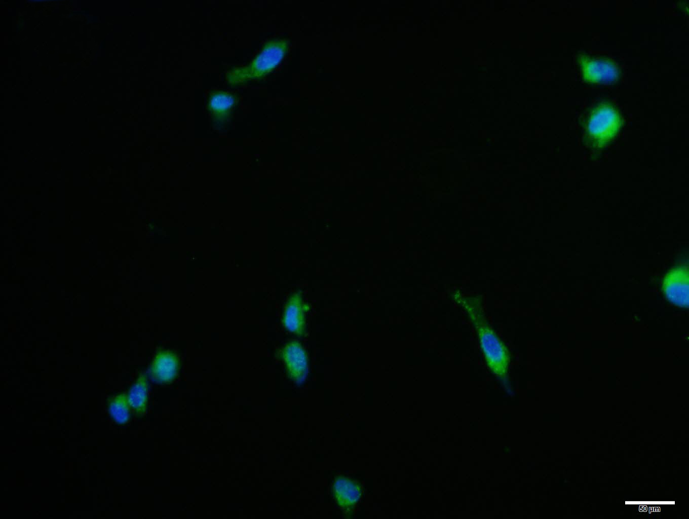 U87MG cell; 4% Paraformaldehyde-fixed; Triton X-100 at room temperature for 20 min; Blocking buffer (normal goat serum, C-0005) at 37°C for 20 min; Antibody incubation with (NGFB) polyclonal Antibody, Unconjugated (bs-10806R) 1:100, 90 minutes at 37°C; followed by a conjugated Goat Anti-Rabbit IgG antibody at 37°C for 90 minutes, DAPI (blue, C02-04002) was used to stain the cell nuclei.