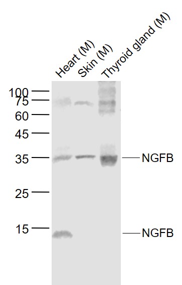 Sample: Lane 1: Heart (Mouse) Lysate at 40 ug Lane 2: Skin (Mouse) Lysate at 40 ug Lane 3: Thyroid gland (Mouse) Lysate at 40 ug Primary: Anti-NGFB (bs-10806R) at 1/1000 dilution Secondary: IRDye800CW Goat Anti-Rabbit IgG at 1/20000 dilution Predicted band size: 32/13 kD Observed band size: 35/13 kD