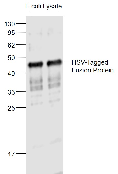 Sample: Lane1: HSV-Tagged Fusion Protein Overexpression E.coli Lysate at 2ug Lane2: HSV-Tagged Fusion Protein Overexpression E.coli Lysate at 2ug Primary: Anti-HSV tag (bs-20157R) at 1/1000 dilution Secondary: IRDye800CW Goat Anti-Rabbit IgG at 1/20000 dilution Predicted band size: 41 kD Observed band size: 45 kD