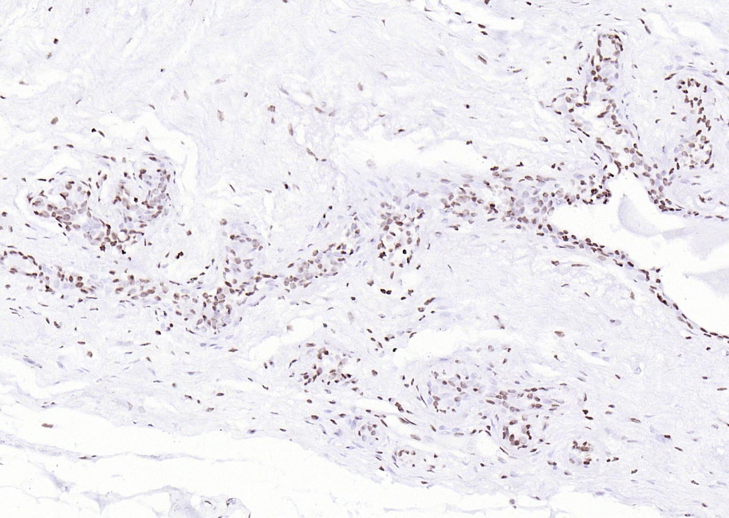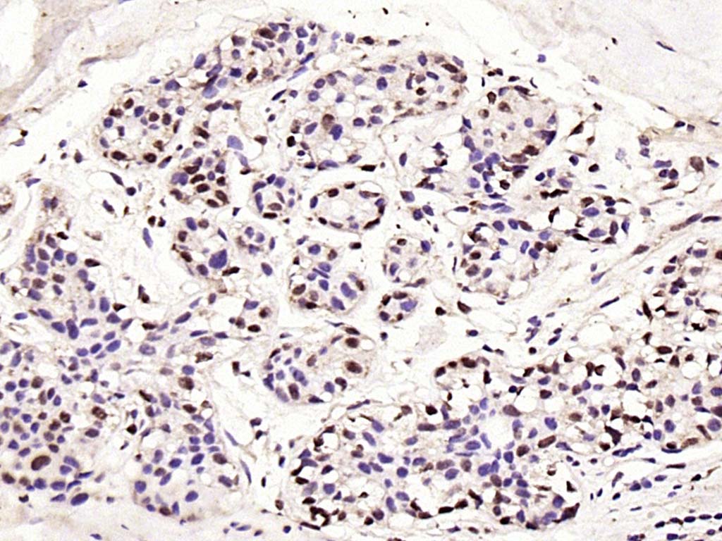 Paraformaldehyde-fixed, paraffin embedded (human breast carcinoma); Antigen retrieval by boiling in sodium citrate buffer (pH6.0) for 15min; Block endogenous peroxidase by 3% hydrogen peroxide for 20 minutes; Blocking buffer (normal goat serum) at 37°C for 30min; Antibody incubation with (P53(Mono Methyl Lys370)) Monoclonal Antibody, Unconjugated (bsm-33209M) at 1:200 overnight at 4°C, followed by operating according to SP Kit(Mouse)(sp-0024) instructionsand DAB staining.