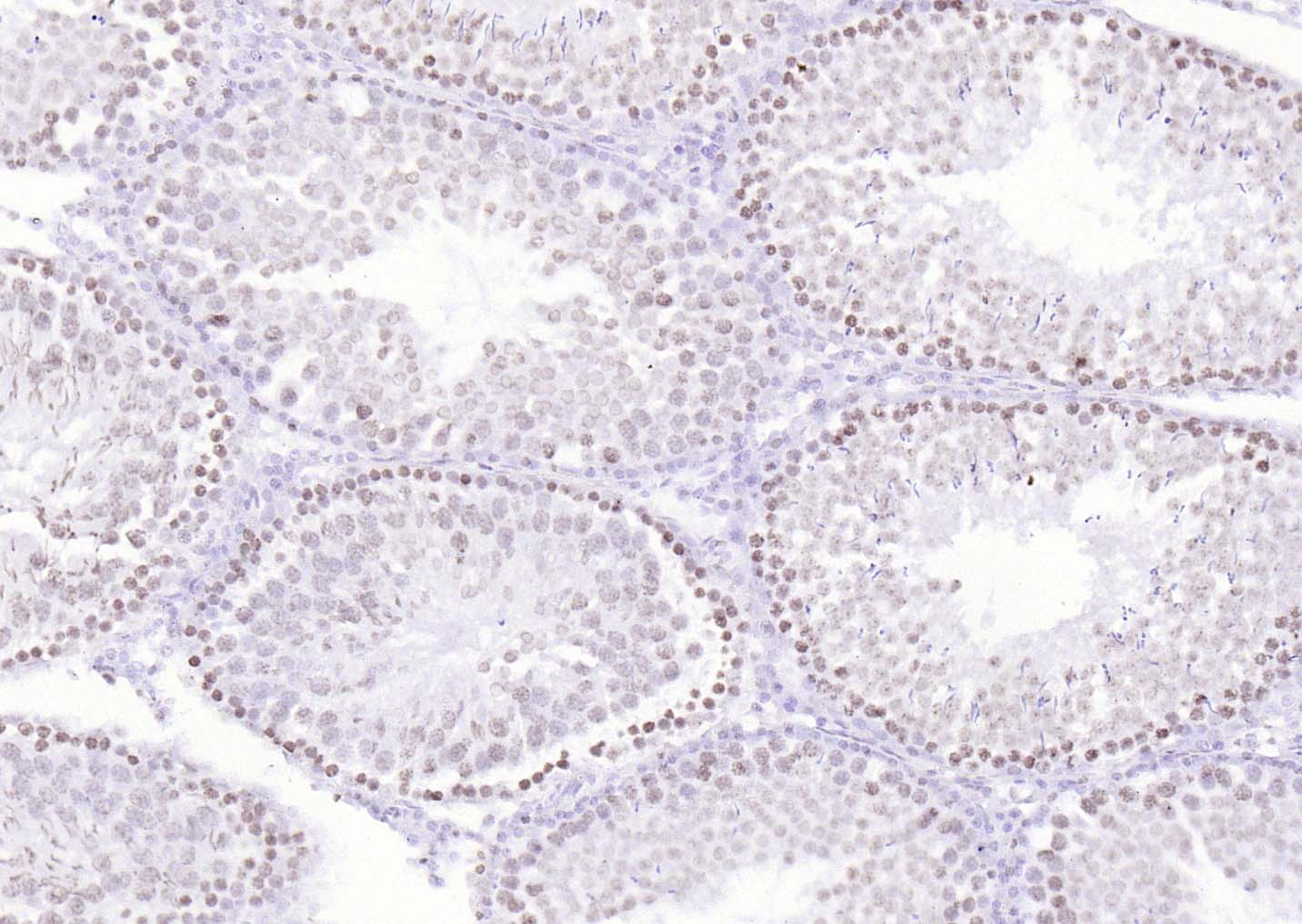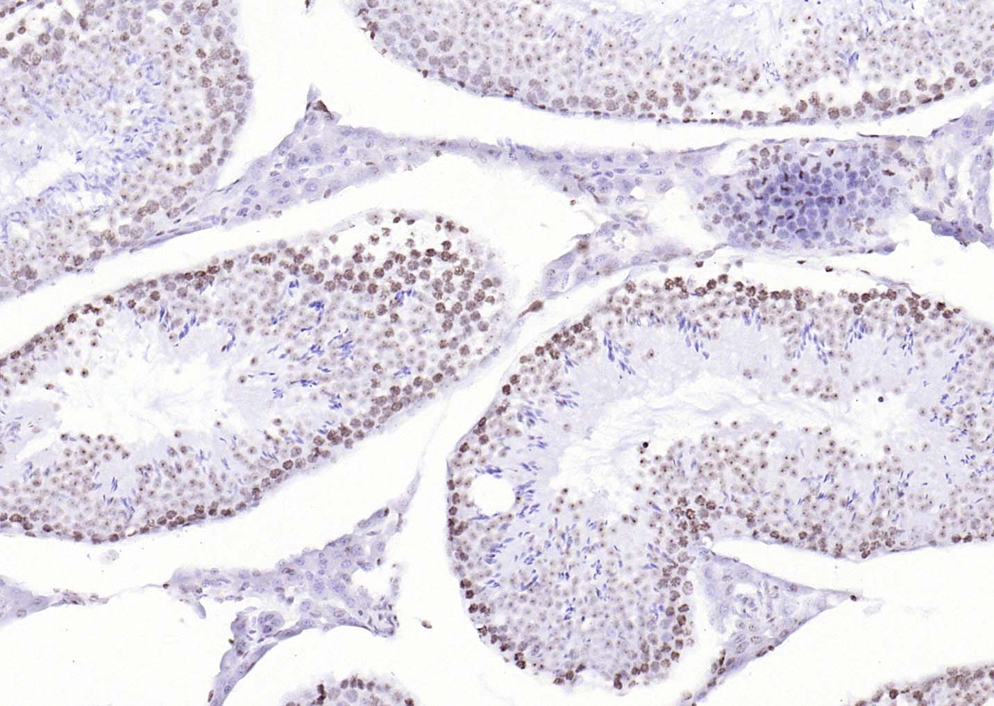 Paraformaldehyde-fixed, paraffin embedded (rat testis); Antigen retrieval by boiling in sodium citrate buffer (pH6.0) for 15min; Block endogenous peroxidase by 3% hydrogen peroxide for 20 minutes; Blocking buffer (normal goat serum) at 37°C for 30min; Antibody incubation with (P53(Mono Methyl Lys370)) Monoclonal Antibody, Unconjugated (bsm-33209M) at 1:200 overnight at 4°C, followed by operating according to SP Kit(Mouse)(sp-0024) instructionsand DAB staining.