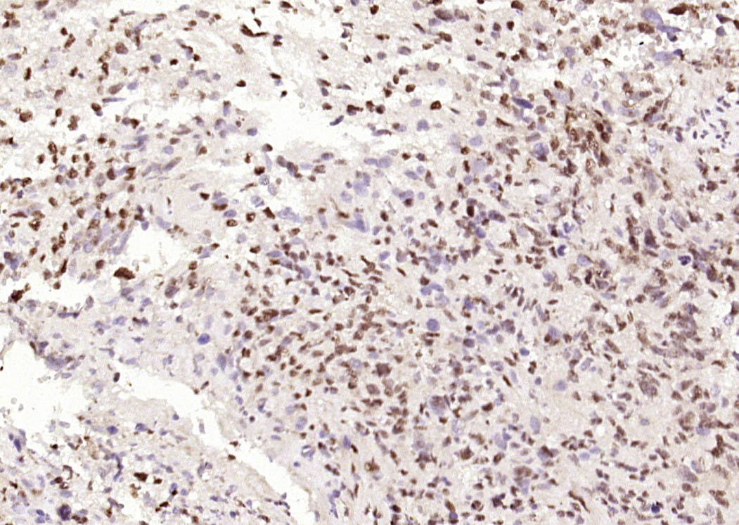 Paraformaldehyde-fixed, paraffin embedded (Human brain glioma); Antigen retrieval by boiling in sodium citrate buffer (pH6.0) for 30min; Block endogenous peroxidase by 3% hydrogen peroxide for 20 minutes; Blocking buffer (normal goat serum) at 37°C for 30min; Antibody incubation with (P53(Mono Methyl Lys370)) Monoclonal Antibody, Unconjugated (bsm-33209M) at 1:400 overnight at 4°C, followed by operating according to SP Kit(Mouse) (sp-0024) instructionsand DAB staining.