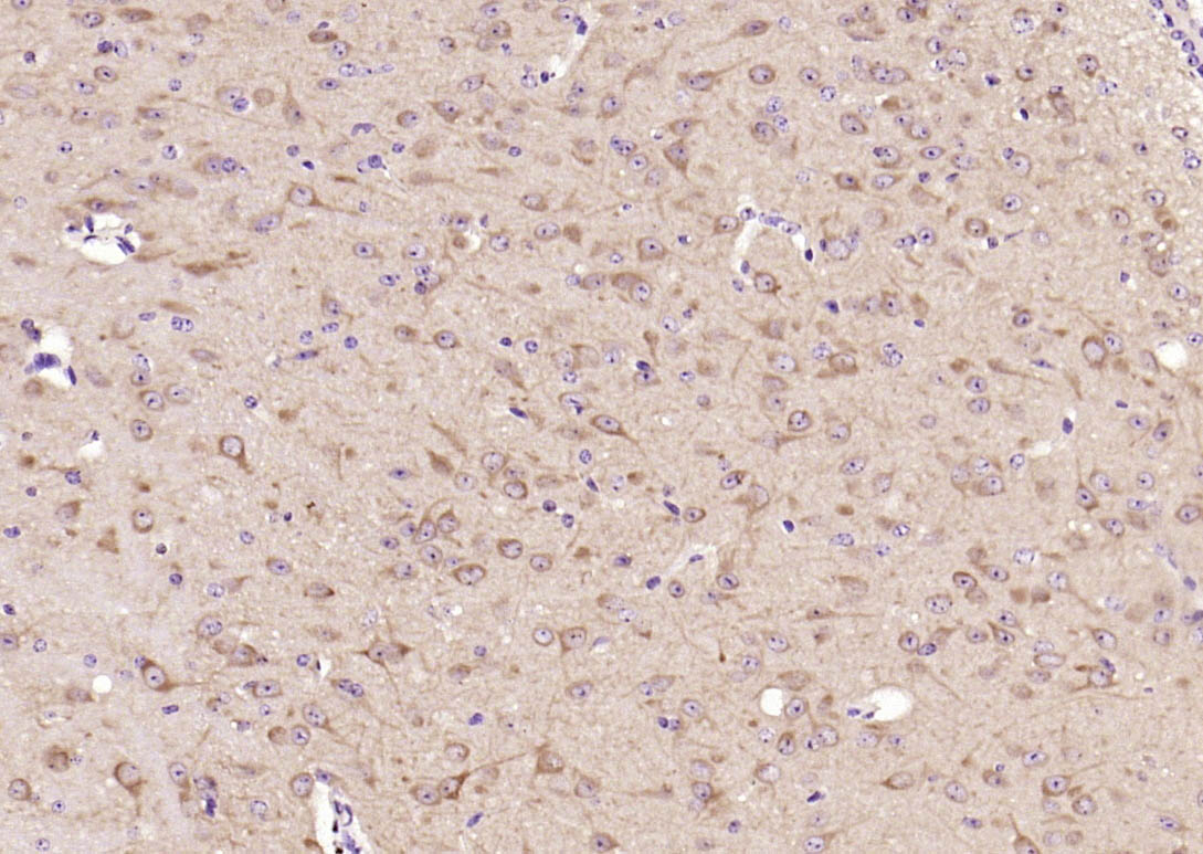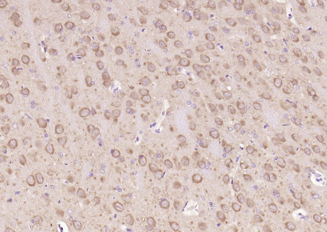 Paraformaldehyde-fixed, paraffin embedded (rat brain); Antigen retrieval by boiling in sodium citrate buffer (pH6.0) for 15min; Block endogenous peroxidase by 3% hydrogen peroxide for 20 minutes; Blocking buffer (normal goat serum) at 37°C for 30min; Antibody incubation with (GSK-3 Beta) Monoclonal Antibody, Unconjugated (bsm-33293M) at 1:200 overnight at 4°C, followed by operating according to SP Kit(Mouse)(sp-0024) instructionsand DAB staining.