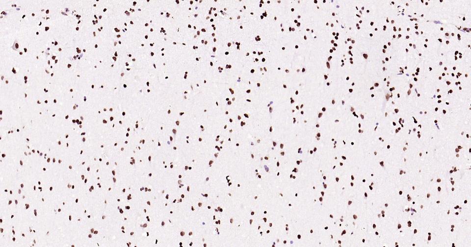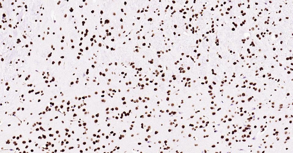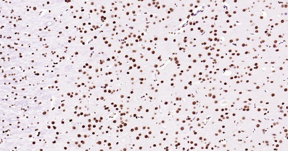 Paraformaldehyde-fixed, paraffin embedded Human Cerebrum; Antigen retrieval by boiling in sodium citrate buffer (pH6.0) for 15 min; Antibody incubation with Histone H3 Monoclonal Antibody, Unconjugated (ascites of bsm-33042M) at 1:1500 overnight at 4°C, followed by conjugation to the bs-40296G-HRP and DAB (C-0010) staining.