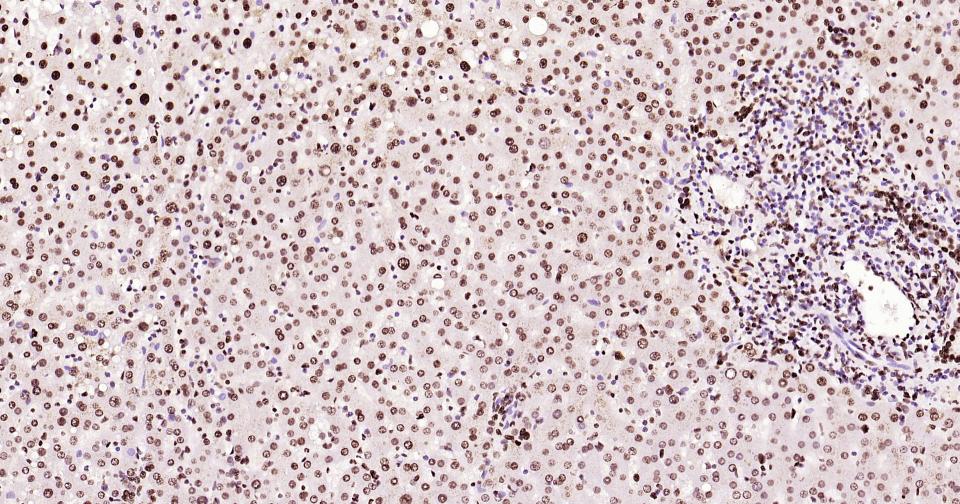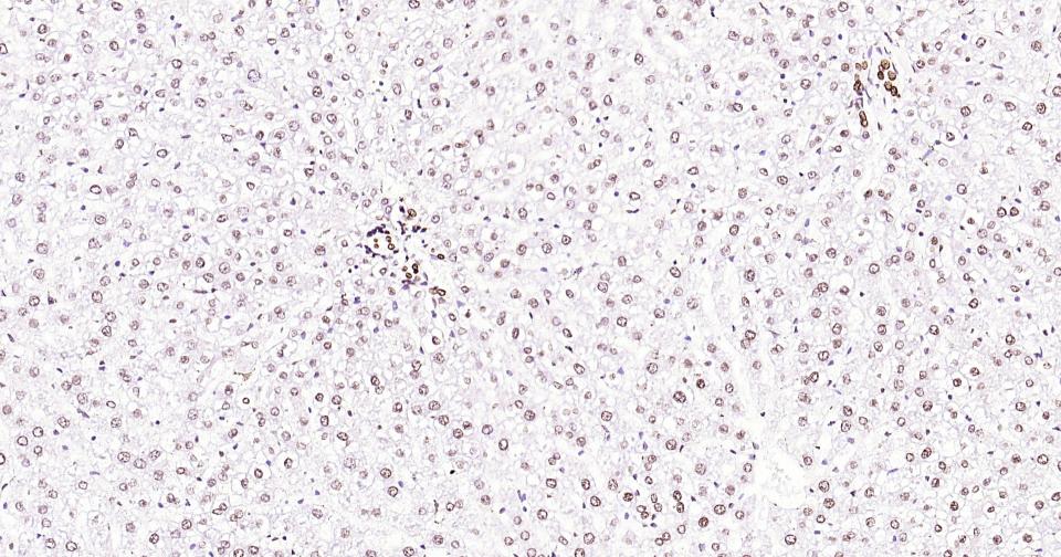Paraformaldehyde-fixed, paraffin embedded Rat Liver; Antigen retrieval by boiling in sodium citrate buffer (pH6.0) for 15 min; Antibody incubation with Histone H3 Monoclonal Antibody, Unconjugated (ascites of bsm-33042M) at 1:1500 overnight at 4°C, followed by conjugation to the bs-40296G-HRP and DAB (C-0010) staining.