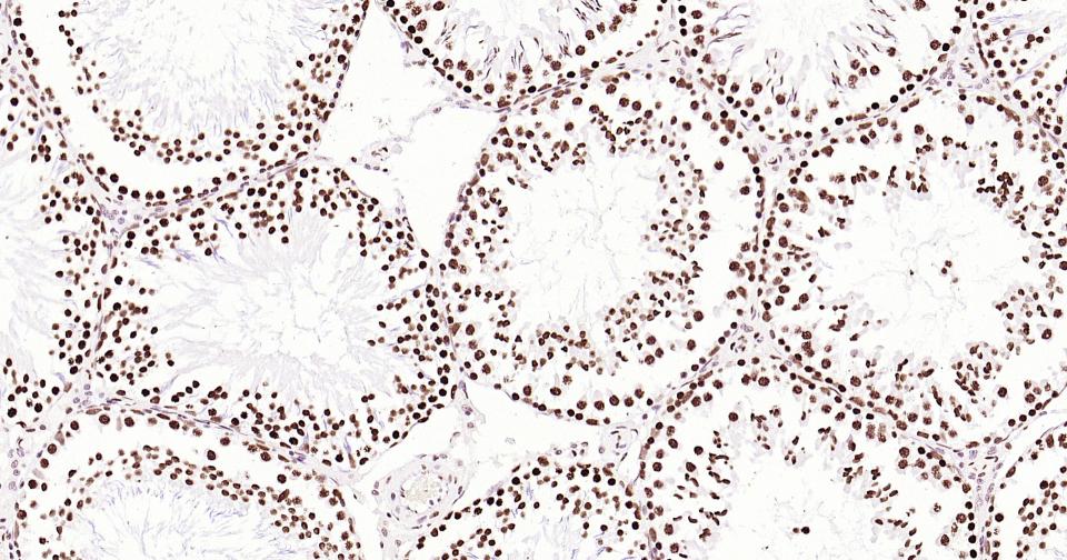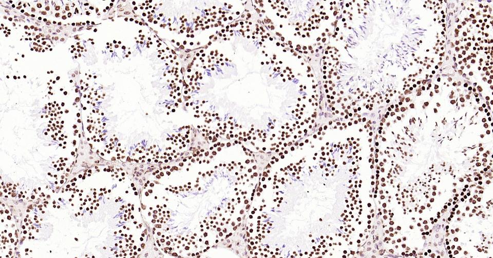 Paraformaldehyde-fixed, paraffin embedded Rat Testicles; Antigen retrieval by boiling in sodium citrate buffer (pH6.0) for 15 min; Antibody incubation with Histone H3 Monoclonal Antibody, Unconjugated (ascites of bsm-33042M) at 1:1500 overnight at 4°C, followed by conjugation to the bs-40296G-HRP and DAB (C-0010) staining.