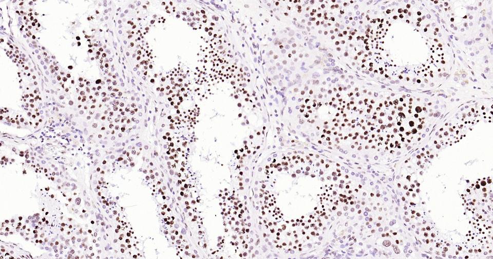 Paraformaldehyde-fixed, paraffin embedded Human Testicles; Antigen retrieval by boiling in sodium citrate buffer (pH6.0) for 15 min; Antibody incubation with Histone H3 Monoclonal Antibody, Unconjugated (ascites of bsm-33042M) at 1:1500 overnight at 4°C, followed by conjugation to the bs-40296G-HRP and DAB (C-0010) staining.