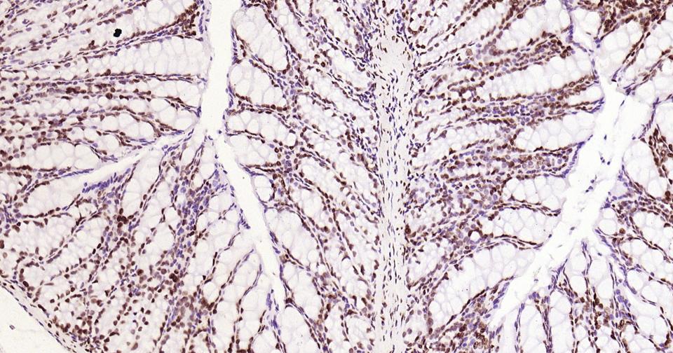 Paraformaldehyde-fixed, paraffin embedded Mouse Colon; Antigen retrieval by boiling in sodium citrate buffer (pH6.0) for 15 min; Antibody incubation with Histone H3 Monoclonal Antibody, Unconjugated (ascites of bsm-33042M) at 1:1500 overnight at 4°C, followed by conjugation to the bs-40296G-HRP and DAB (C-0010) staining.