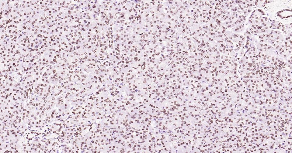 Paraformaldehyde-fixed, paraffin embedded Human Pancreas; Antigen retrieval by boiling in sodium citrate buffer (pH6.0) for 15 min; Antibody incubation with Histone H3 Monoclonal Antibody, Unconjugated (ascites of bsm-33042M) at 1:1500 overnight at 4°C, followed by conjugation to the bs-40296G-HRP and DAB (C-0010) staining.
