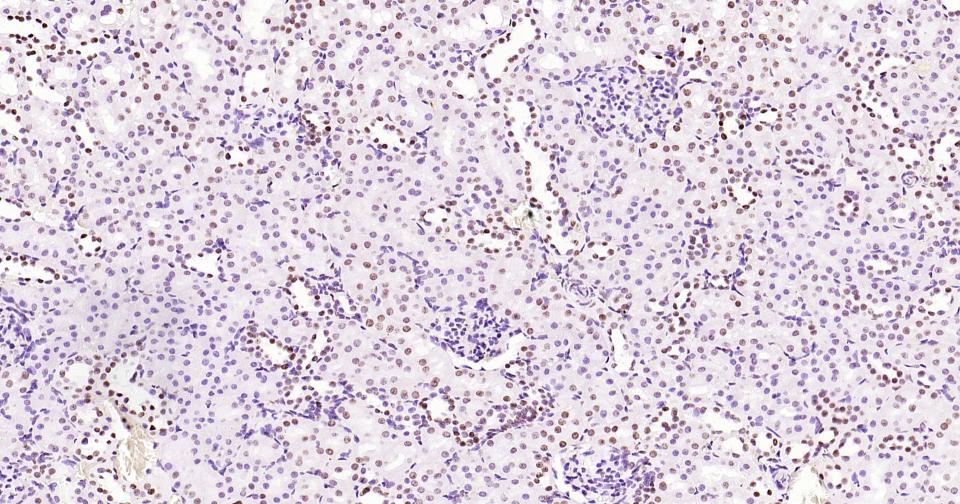 Paraformaldehyde-fixed, paraffin embedded Rat Kidney; Antigen retrieval by boiling in sodium citrate buffer (pH6.0) for 15 min; Antibody incubation with Histone H3 Monoclonal Antibody, Unconjugated (ascites of bsm-33042M) at 1:1500 overnight at 4°C, followed by conjugation to the bs-40296G-HRP and DAB (C-0010) staining.