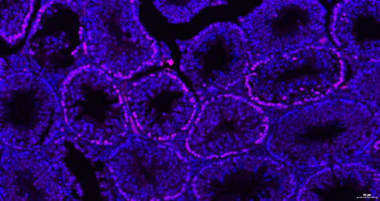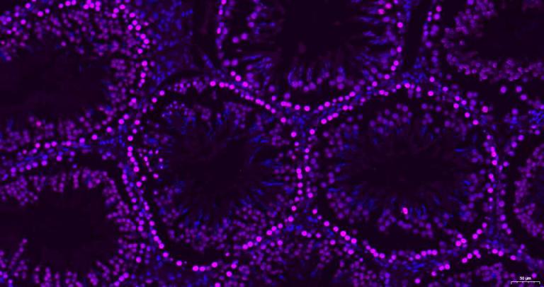 Paraformaldehyde-fixed, paraffin embedded Mouse Testicles; Antigen retrieval by boiling in sodium citrate buffer (pH6.0) for 15 min; Antibody incubation with Histone H3 Monoclonal Antibody, Unconjugated (bsm-33042M) at 1:200 overnight at 4°C. Followed by conjugated Goat Anti-Mouse IgG antibody (Purple, bs-0296G-Cy5), DAPI (blue, C02-04002) was used to stain the cell nuclei.