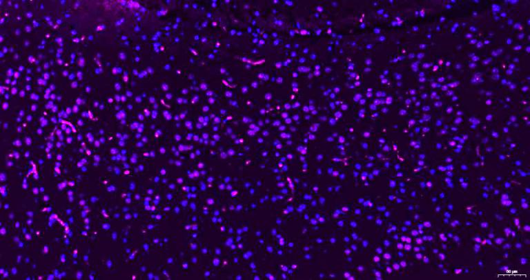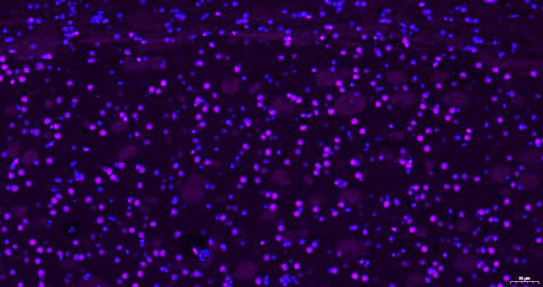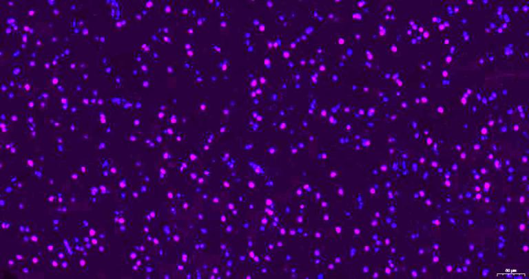 Paraformaldehyde-fixed, paraffin embedded Rat Cerebrum; Antigen retrieval by boiling in sodium citrate buffer (pH6.0) for 15 min; Antibody incubation with Histone H3 Monoclonal Antibody, Unconjugated (bsm-33042M) at 1:200 overnight at 4°C. Followed by conjugated Goat Anti-Mouse IgG antibody (Purple, bs-0296G-Cy5), DAPI (blue, C02-04002) was used to stain the cell nuclei.