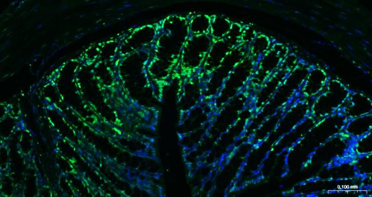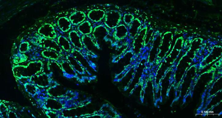 Paraformaldehyde-fixed, paraffin embedded Mouse Colon; Antigen retrieval by boiling in sodium citrate buffer (pH6.0) for 15 min; Antibody incubation with Histone H3 Monoclonal Antibody, Unconjugated (bsm-33042M) at 1:200 overnight at 4°C. Followed by conjugated Goat Anti-Mouse IgG antibody (green, bs-0296G-BF488), DAPI (blue, C02-04002) was used to stain the cell nuclei.