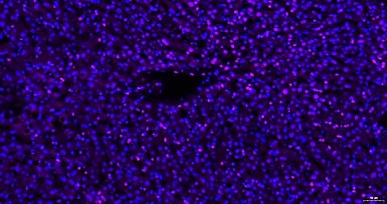 Paraformaldehyde-fixed, paraffin embedded Human Liver; Antigen retrieval by boiling in sodium citrate buffer (pH6.0) for 15 min; Antibody incubation with Histone H3 Monoclonal Antibody, Unconjugated (bsm-33042M) at 1:200 overnight at 4°C. Followed by conjugated Goat Anti-Mouse IgG antibody (Purple, bs-0296G-Cy5), DAPI (blue, C02-04002) was used to stain the cell nuclei.