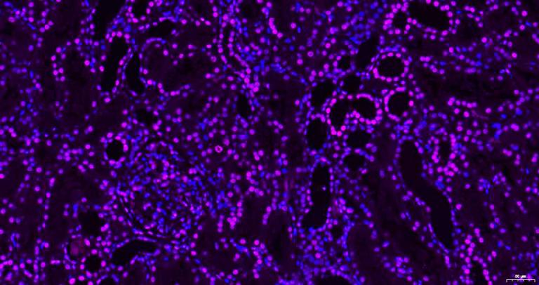 Paraformaldehyde-fixed, paraffin embedded Human Kidney; Antigen retrieval by boiling in sodium citrate buffer (pH6.0) for 15 min; Antibody incubation with Histone H3 Monoclonal Antibody, Unconjugated (bsm-33042M) at 1:200 overnight at 4°C. Followed by conjugated Goat Anti-Mouse IgG antibody (Purple, bs-0296G-Cy5), DAPI (blue, C02-04002) was used to stain the cell nuclei.