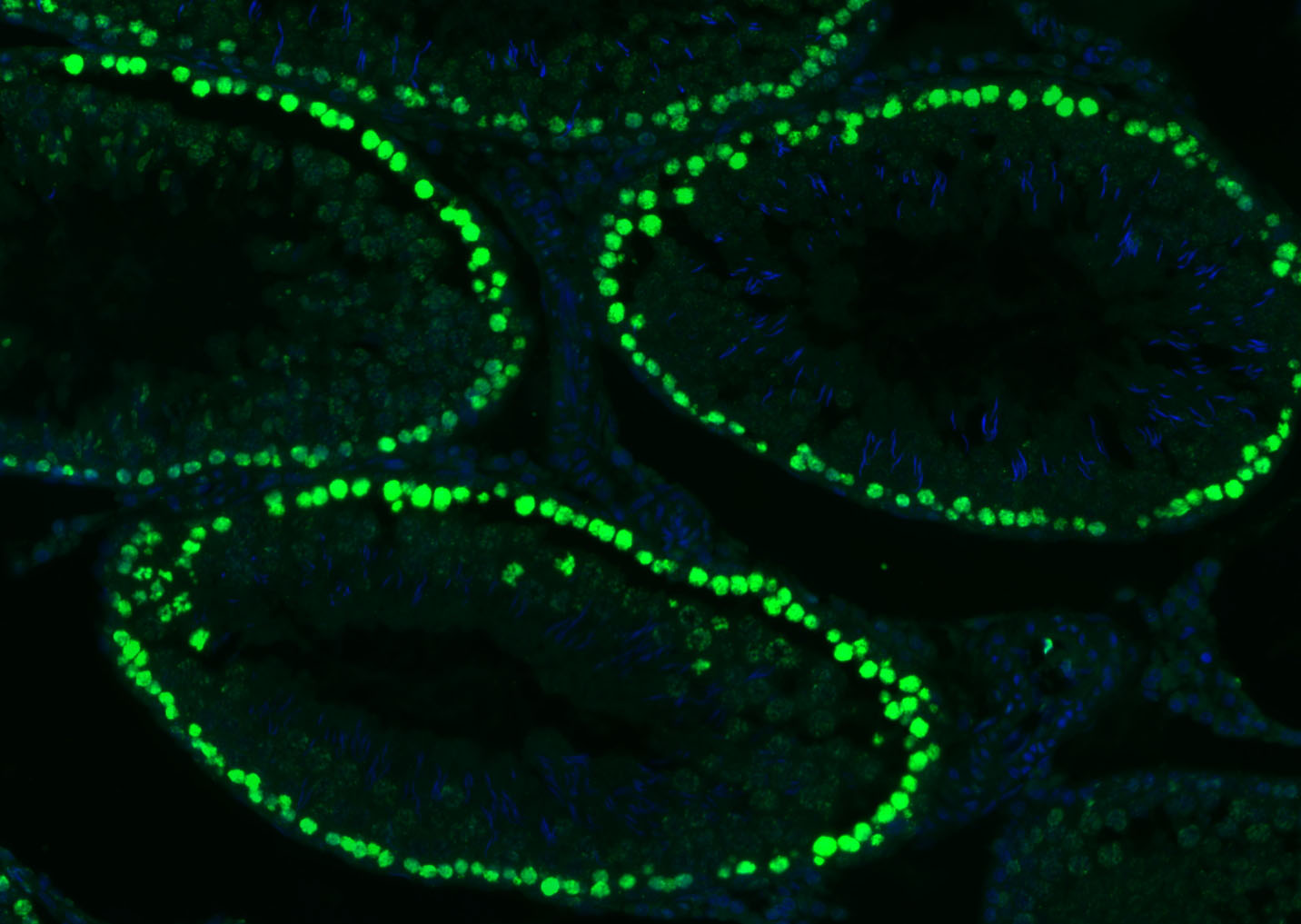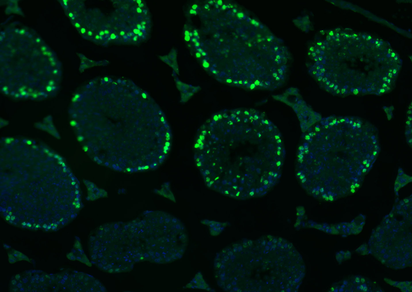 Paraformaldehyde-fixed, paraffin embedded (mouse testis); Antigen retrieval by boiling in sodium citrate buffer (pH6.0) for 15min; Blocking buffer (normal goat serum) at 37°C for 30min; Antibody incubation with (Histone H3 (Nuclear Loading Control)) Monoclonal Antibody, Unconjugated (bsm-33042M ) at 1:300 overnight at 4°C, followed by a conjugated Goat Anti- Mouse IgG antibody (YF488) for 90 minutes, and DAPI for nuclei staining.