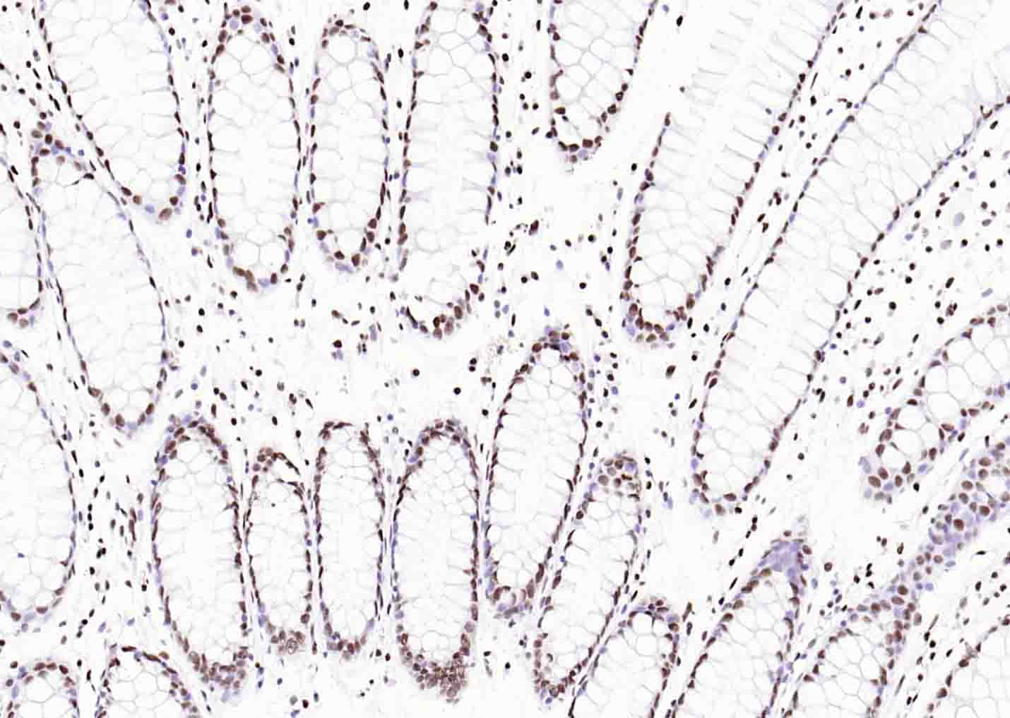 Paraformaldehyde-fixed, paraffin embedded (human colon); Antigen retrieval by boiling in sodium citrate buffer (pH6.0) for 15min; Block endogenous peroxidase by 3% hydrogen peroxide for 20 minutes; Blocking buffer (normal goat serum) at 37°C for 30min; Antibody incubation with (Histone H3 (Nuclear Loading Control)) Monoclonal Antibody, Unconjugated (bsm-33042M) at 1:200 overnight at 4°C, followed by operating according to SP Kit(Mouse)(sp-0024) instructionsand DAB staining.