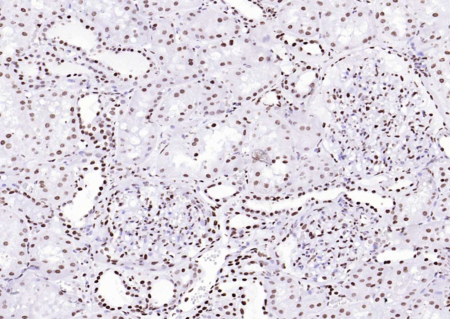 Paraformaldehyde-fixed, paraffin embedded (Human kidney); Antigen retrieval by boiling in sodium citrate buffer (pH6.0) for 15min; Block endogenous peroxidase by 3% hydrogen peroxide for 20 minutes; Blocking buffer (normal goat serum) at 37°C for 30min; Antibody incubation with (Histone H3 (Nuclear Loading Control)) Monoclonal Antibody, Unconjugated (bsm-33042M) at 1:200 overnight at 4°C, followed by operating according to SP Kit(Mouse)(sp-0024) instructionsand DAB staining.