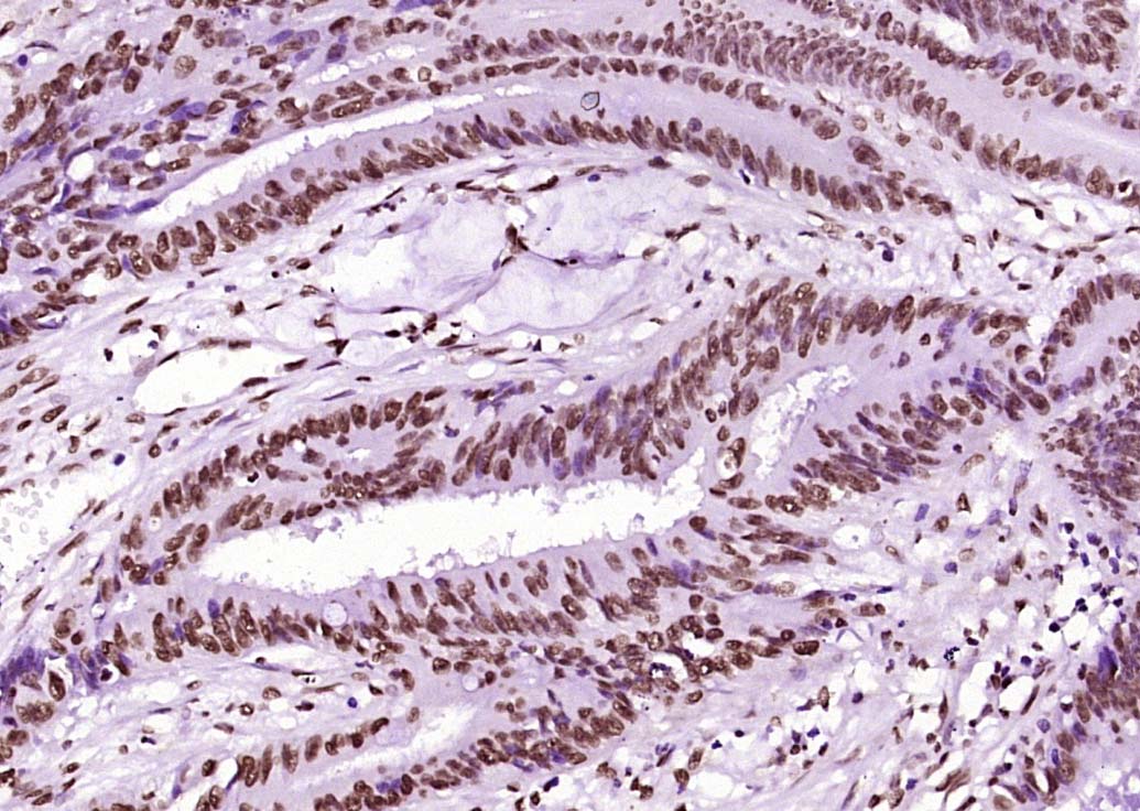 Paraformaldehyde-fixed, paraffin embedded (Human colon carcinoma); Antigen retrieval by boiling in sodium citrate buffer (pH6.0) for 15min; Block endogenous peroxidase by 3% hydrogen peroxide for 20 minutes; Blocking buffer (normal goat serum) at 37°C for 30min; Antibody incubation with (Histone H3(di methyl K36)) Monoclonal Antibody, Unconjugated (ascites of bsm-33124M 3F7) at 1:2000 overnight at 4°C, followed by a conjugated secondary (sp-0024) for 20 minutes and DAB staining.