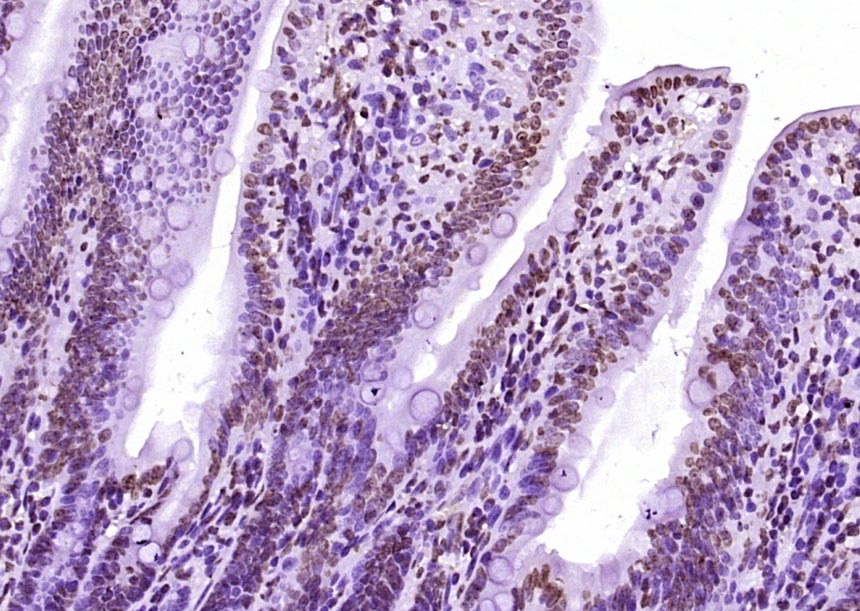 Paraformaldehyde-fixed, paraffin embedded (Mouse intestine); Antigen retrieval by boiling in sodium citrate buffer (pH6.0) for 15min; Block endogenous peroxidase by 3% hydrogen peroxide for 20 minutes; Blocking buffer (normal goat serum) at 37°C for 30min; Antibody incubation with (Histone H3(di methyl K36)) Monoclonal Antibody, Unconjugated (ascites of bsm-33124M 3F7) at 1:2000 overnight at 4°C, followed by a conjugated secondary (sp-0024) for 20 minutes and DAB staining.