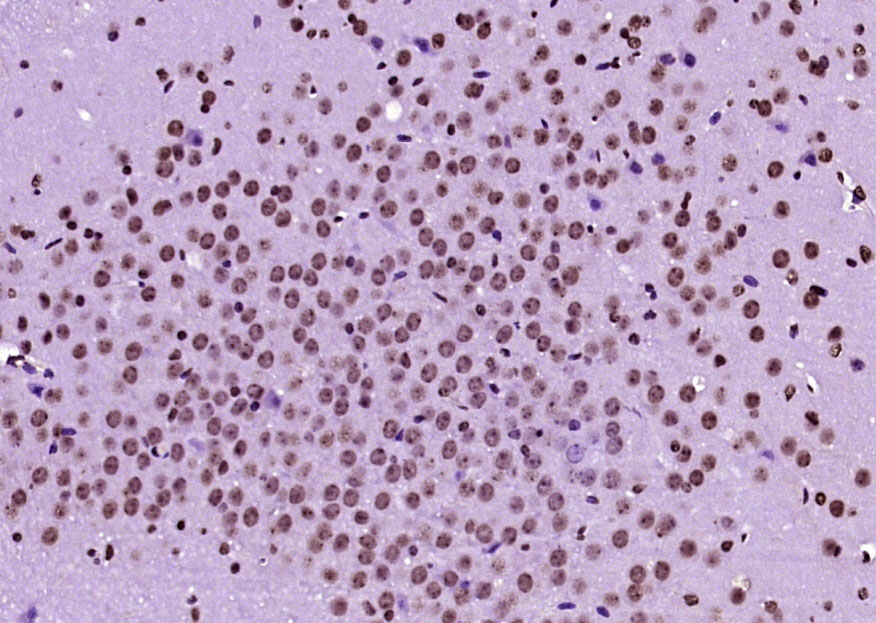 Paraformaldehyde-fixed, paraffin embedded (Mouse brain); Antigen retrieval by boiling in sodium citrate buffer (pH6.0) for 15min; Block endogenous peroxidase by 3% hydrogen peroxide for 20 minutes; Blocking buffer (normal goat serum) at 37°C for 30min; Antibody incubation with (Histone H3(di methyl K36)) Monoclonal Antibody, Unconjugated (ascites of bsm-33124M 3F7) at 1:2000 overnight at 4°C, followed by a conjugated secondary (sp-0024) for 20 minutes and DAB staining.