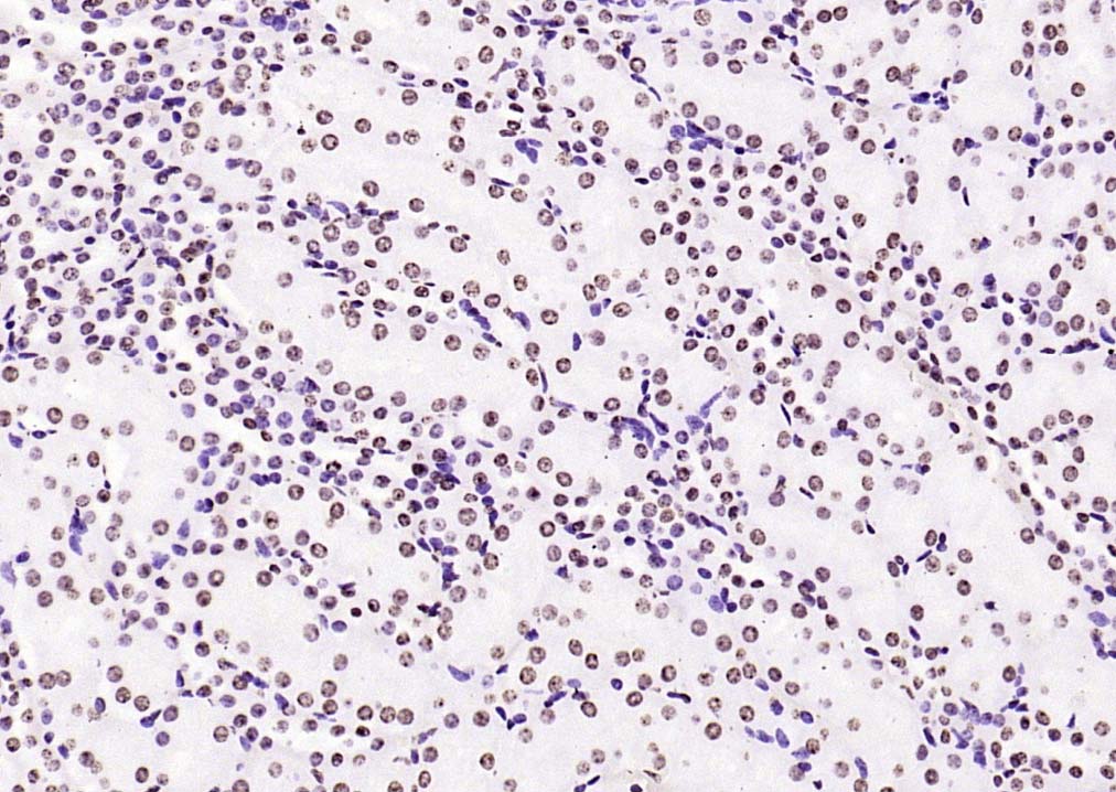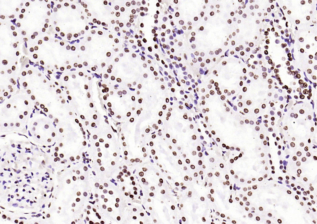Paraformaldehyde-fixed, paraffin embedded (rat kidney); Antigen retrieval by boiling in sodium citrate buffer (pH6.0) for 15min; Block endogenous peroxidase by 3% hydrogen peroxide for 20 minutes; Blocking buffer (normal goat serum) at 37°C for 30min; Antibody incubation with (Histone H3(di methyl K36)) Monoclonal Antibody, Unconjugated (ascites of bsm-33124M 1E6) at 1:2000 overnight at 4°C, followed by operating according to SP Kit(Mouse) (sp-0024) instructions and DAB staining.