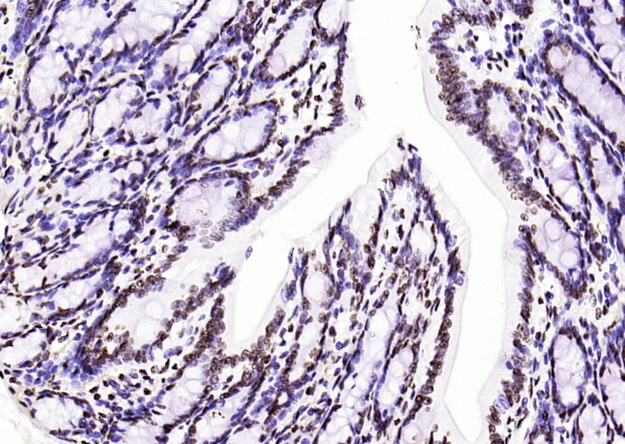 Paraformaldehyde-fixed, paraffin embedded (human colon); Antigen retrieval by boiling in sodium citrate buffer (pH6.0) for 15min; Block endogenous peroxidase by 3% hydrogen peroxide for 20 minutes; Blocking buffer (normal goat serum) at 37°C for 30min; Antibody incubation with (Histone H3(di methyl K36)) Monoclonal Antibody, Unconjugated (ascites of bsm-33124M 1E6) at 1:2000 overnight at 4°C, followed by operating according to SP Kit(Mouse) (sp-0024) instructions and DAB staining.