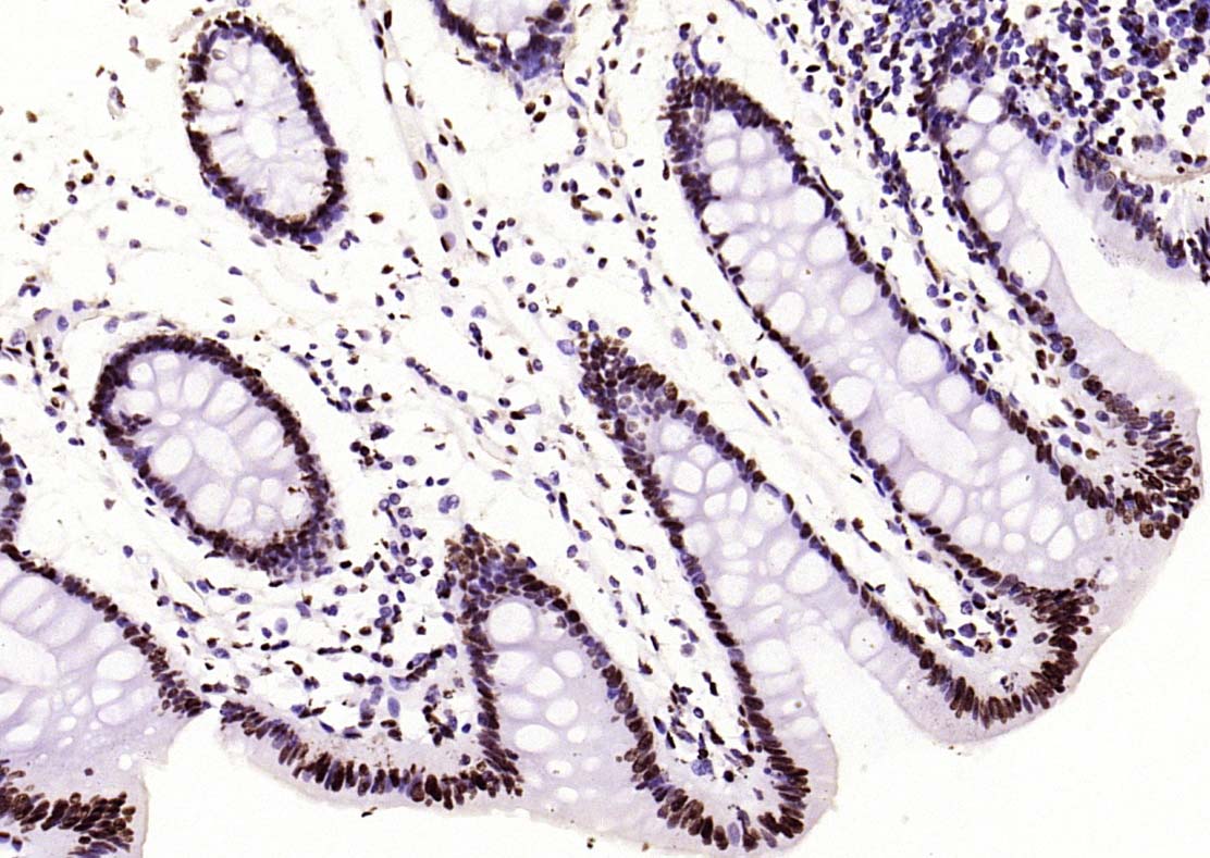 Paraformaldehyde-fixed, paraffin embedded (rat colon); Antigen retrieval by boiling in sodium citrate buffer (pH6.0) for 15min; Block endogenous peroxidase by 3% hydrogen peroxide for 20 minutes; Blocking buffer (normal goat serum) at 37°C for 30min; Antibody incubation with (Histone H3(di methyl K36)) Monoclonal Antibody, Unconjugated (ascites of bsm-33124M 1E6) at 1:2000 overnight at 4°C, followed by operating according to SP Kit(Mouse) (sp-0024) instructions and DAB staining.