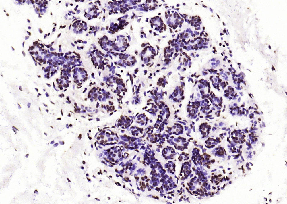 Paraformaldehyde-fixed, paraffin embedded (human breast); Antigen retrieval by boiling in sodium citrate buffer (pH6.0) for 15min; Block endogenous peroxidase by 3% hydrogen peroxide for 20 minutes; Blocking buffer (normal goat serum) at 37°C for 30min; Antibody incubation with (Histone H3(di methyl K36)) Monoclonal Antibody, Unconjugated (ascites of bsm-33124M 1E6) at 1:2000 overnight at 4°C, followed by operating according to SP Kit(Mouse) (sp-0024) instructions and DAB staining.