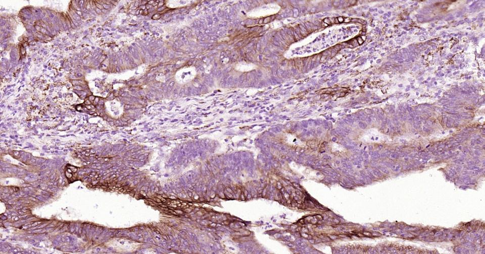 Paraformaldehyde-fixed, paraffin embedded Human Rectal Cancer; Antigen retrieval by boiling in sodium citrate buffer (pH6.0) for 15 min; Antibody incubation with Cytokeratin 19 Monoclonal Antibody, Unconjugated (ascites of bsm-33057M) at 1:800 overnight at 4°C, followed by conjugation to the bs-40296G-HRP and DAB (C-0010) staining.