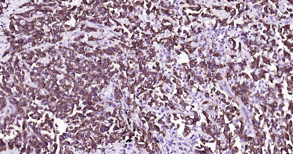 Paraformaldehyde-fixed, paraffin embedded (Human stomach cancer); Antigen retrieval by boiling in sodium citrate buffer (pH6.0) for 15min; Block endogenous peroxidase by 3% hydrogen peroxide for 20 minutes; Blocking buffer (normal goat serum) at 37°C for 30min; Antibody incubation with (Cytokeratin 19) Monoclonal Antibody, Unconjugated (bsm-33057M) at 1:400 overnight at 4°C, followed by operating according to SP Kit(Mouse) (sp-0024) instructionsand DAB staining.