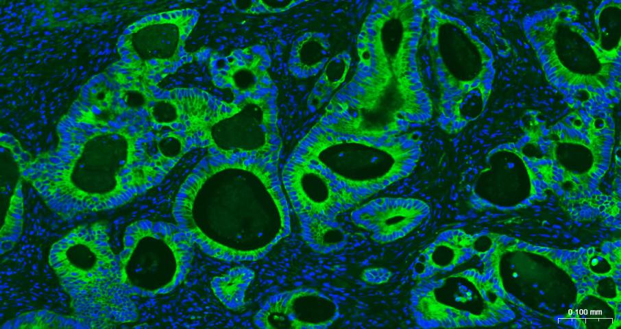 Paraformaldehyde-fixed, paraffin embedded Human Colon Cancer; Antigen retrieval by boiling in sodium citrate buffer (pH6.0) for 15 min; Antibody incubation with Cytokeratin 19 Monoclonal Antibody, Unconjugated (bsm-33057M) at 1:500 overnight at 4°C. Followed by conjugated Goat Anti-Mouse IgG antibody (green, bs-0296G-BF488), DAPI (blue, C02-04002) was used to stain the cell nuclei.