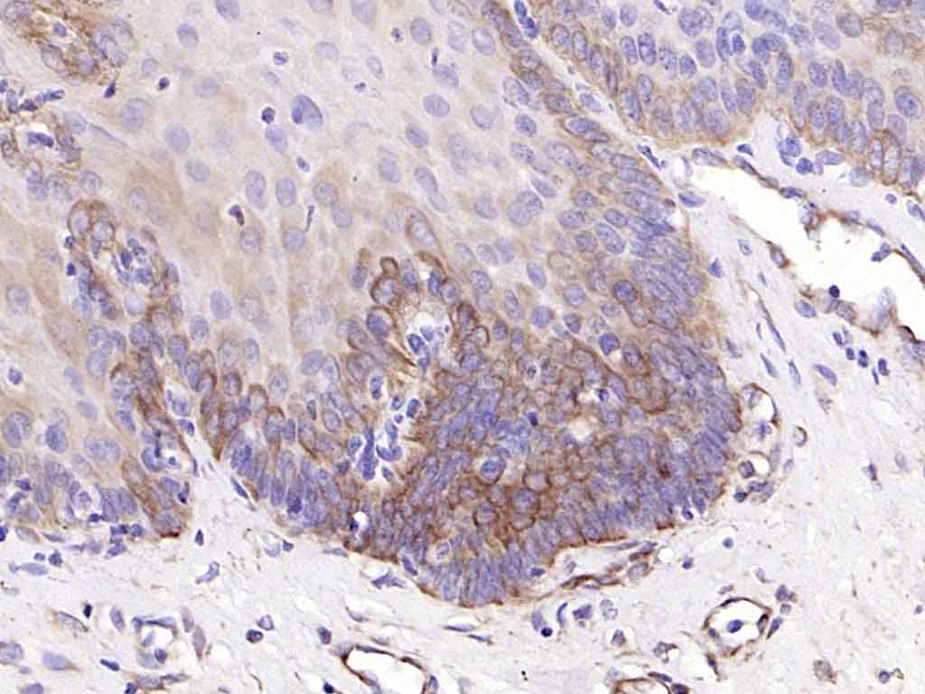 Paraformaldehyde-fixed, paraffin embedded (Human esophageal); Antigen retrieval by boiling in sodium citrate buffer (pH6.0) for 15min; Block endogenous peroxidase by 3% hydrogen peroxide for 20 minutes; Blocking buffer (normal goat serum) at 37°C for 30min; Antibody incubation with (Cytokeratin 19) Monoclonal Antibody, Unconjugated (bsm-33057M) at 1:200 overnight at 4°C, followed by operating according to SP Kit(Mouse)(sp-0024) instructionsand DAB staining.