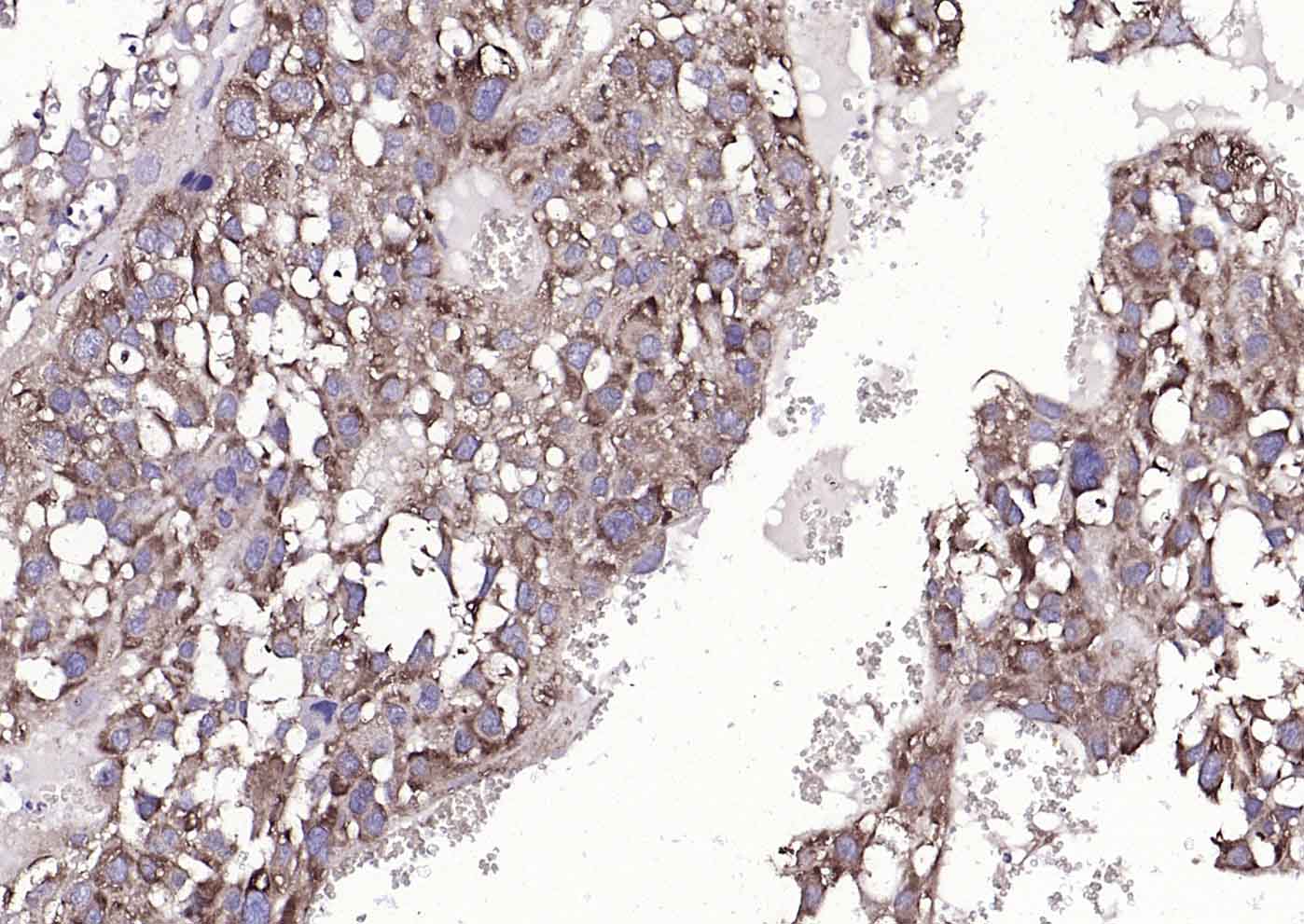 Paraformaldehyde-fixed, paraffin embedded Human Lung Cancer; Antigen retrieval by boiling in sodium citrate buffer (pH6.0) for 15 min; Antibody incubation with Cyclophilin B(Loading Control) Monoclonal Antibody, Unconjugated(bsm-33228M) at 1:200 overnight at 4°C, followed by conjugation to the SP Kit (Mouse, sp-0024) and DAB (C-0010) staining.